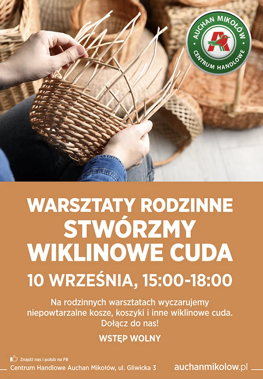 Rodzinne warsztaty wikliniarskie odbędą się w sobotę 10 września od godziny 15.00 do godziny 18.00 w Centrum Handlowym Auchan Gliwice przy ulicy Rybnickiej 207 w Gliwicach oraz w Centrum Handlowym Auchan Mikołów przy ulicy Gliwickiej 3 w Mikołowie. Wstęp wolny.
