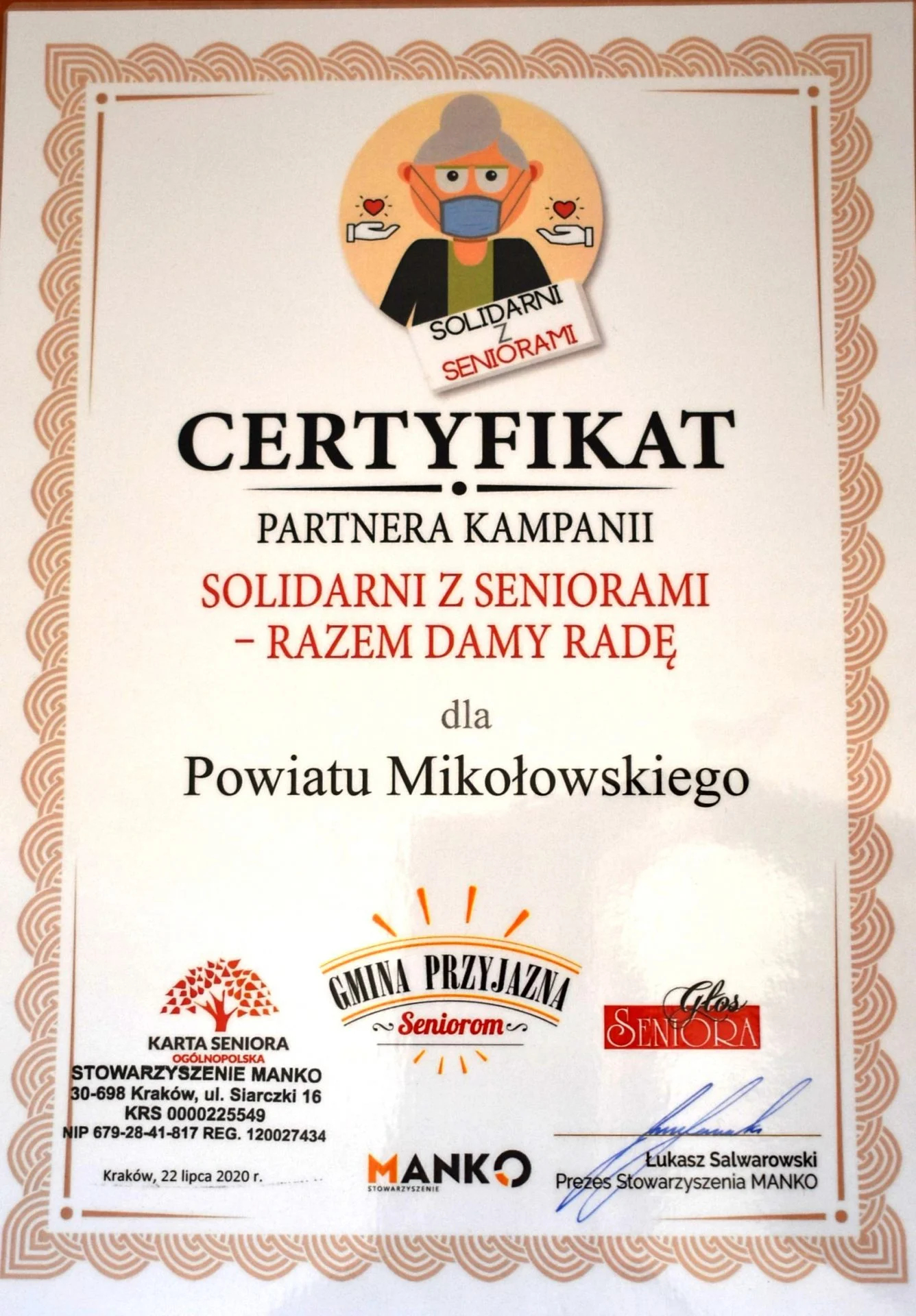 Certyfikat dla Powiatu Mikołowskiego – Partnera Kampanii „Solidarni z Seniorami – Razem Damy Radę” przekazał wczoraj na ręce przedstawiciela powiatu – Specjalisty ds polityki senioralnej Starostwa Powiatowego w Mikołowie Sabiny Grzywok Łukasz Salwarowski – Prezes Stowarzyszenia MANKO oraz ambasador Głosu Seniora Marek Pilch.