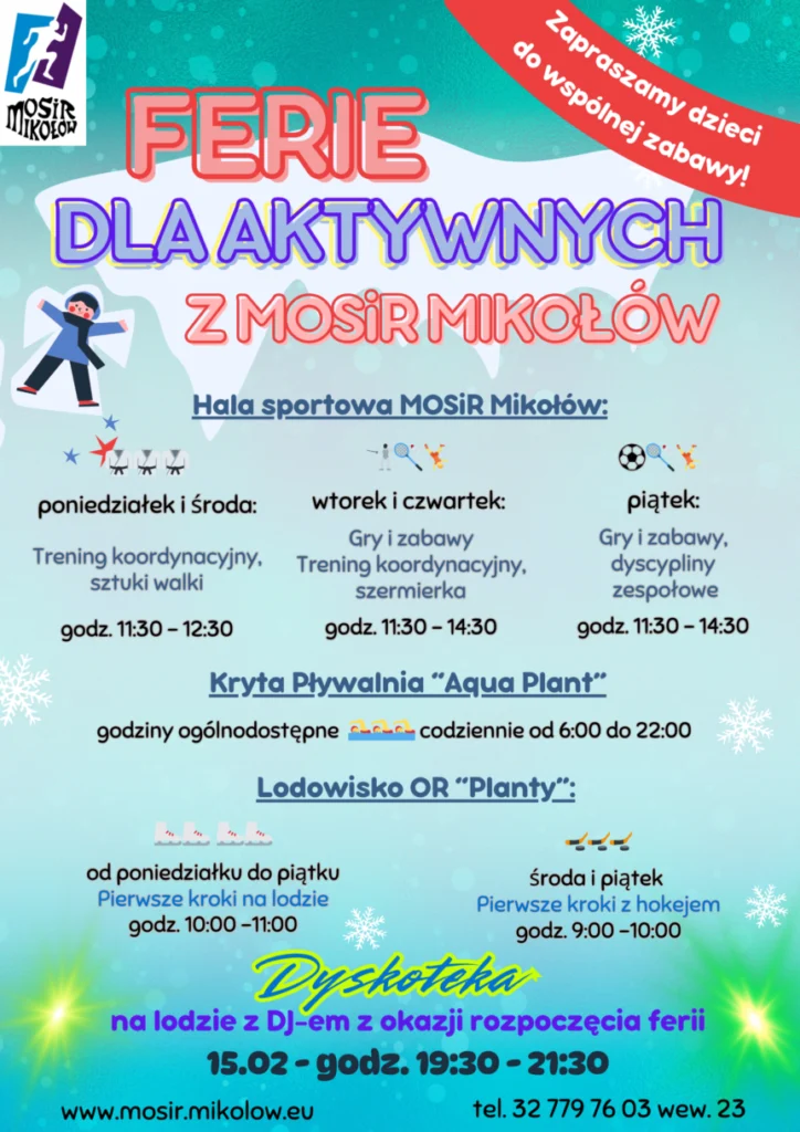 Miejski Ośrodek Sportu i Rekreacji w Mikołowie przygotował wyjątkową ofertę dla dzieci i młodzieży. W dniach 17–28 lutego 2025 roku w ramach akcji „Ferie dla Aktywnych” odbędą się bezpłatne zajęcia sportowe i szkoleniowe prowadzone przez doświadczonych trenerów.