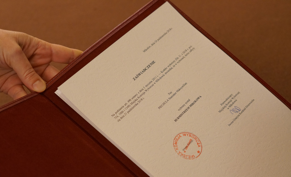 By dopełnić formalności wyborczych, zaświadczenie o powołaniu na stanowisko burmistrza otrzymał z rąk komisarz wyborczej Stanisław Piechula, po czym złożył uroczyste ślubowanie. Do porządku obrad wprowadzony został również wniosek Łukasza Ryguły o wyborze nowych wiceprzewodniczących Rady Miejskiej. Spośród trzech zgłoszonych kandydatur: Stanisławy Hajduk-Bies, Remigiusza Kusia i Michała Rupika na ostatnich wymienionych zagłosowało po 17 radnych, radna z ramienia PiS otrzymała pięć głosów. Tym samym, skład przewodniczących uzupełnili przedstawiciel KWW Razem dla Mikołowa Stanisława Piechuli i KWW Górnośląskich Samorządowców Lokalnych.