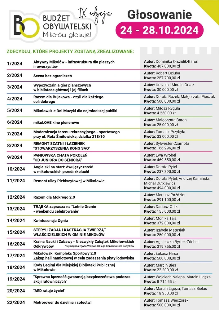 Do końca poniedziałku, 28 października, każdy mieszkaniec miasta, bez względu na wiek, może oddać swój głos na jeden z 21 zakwalifikowanych projektów. Głosowanie odbywa się zarówno online na stronie obywatelski.mikolow.eu, jak i stacjonarnie w godzinach od 9:00 do 18:00 w Miejskiej Bibliotece Publicznej.