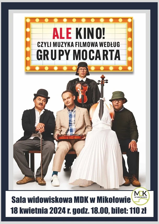 Niezastąpiona Grupa MoCarta postanowiła poświęcić swój nowy program muzyce filmowej i najjaśniejszym gwiazdom srebrnego ekranu. Najbardziej rozpoznawalny kwartet w Polsce zaprezentuje jedyny w swoim rodzaju występ – zarówno osobom, które świat kina znają od podszewki, jak i tym, dla których nadal kryje on w sobie wiele tajemnic. „Ale kino” to żartobliwe spojrzenie na ponadczasowe przeboje muzyki filmowej, spotkania z Charliem Chaplinem, Woodym Allenem, Tomem Hanksem i aktorem, który jest największym przegranym światowego kina…
