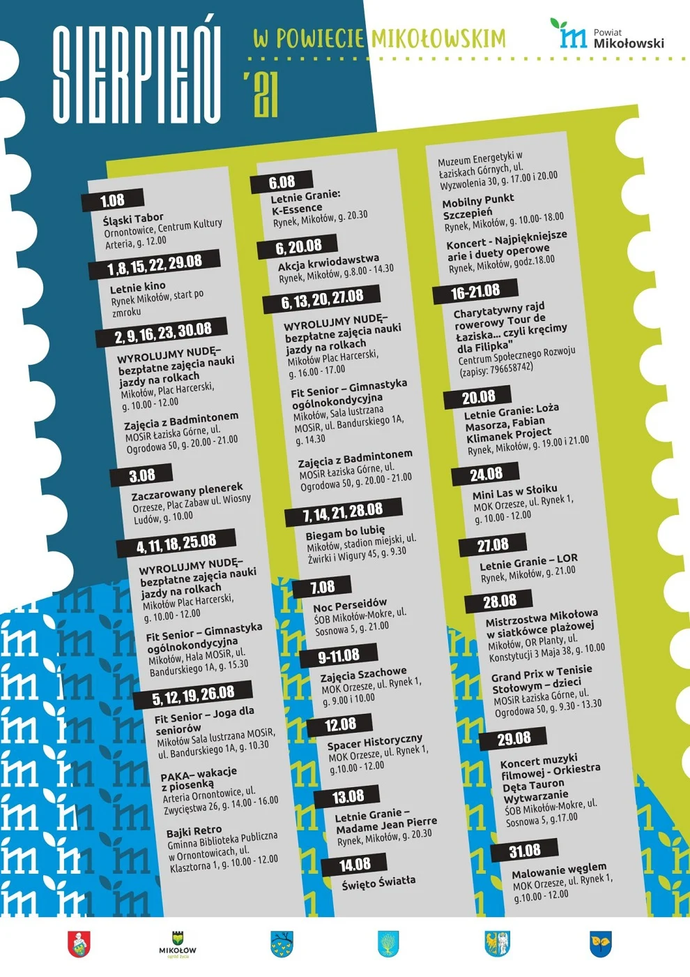 Sierpień w powiecie mikołowskim obfituje w wiele imprez, warsztatów i innych wydarzeń! Każdy znajdzie coś dla siebie. Odbędą się spotkania skierowane do dzieci – warsztaty plastyczne, nauka jazdy na rolkach i deskorolce; rodziców – koncerty, nauka jazdy na rolkach dla dorosłych, zajęcia na siłowni z instruktorem; a także coś dla seniorów – gimnastyka, joga i warsztaty szydełkowania!