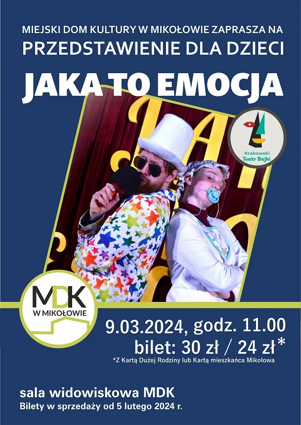 Po feriach zimowych, u progu wiosny, wracamy ze spektaklami dla dzieci w ramach cyklu „Teatr Młodszego Widza”. 9 marca o godz. 11.00 MDK Mikołów zaprasza na spektakl dla dzieci od 3. roku życia „Jaka to emocja!” w wykonaniu Krakowskiego Teatru Bajki.