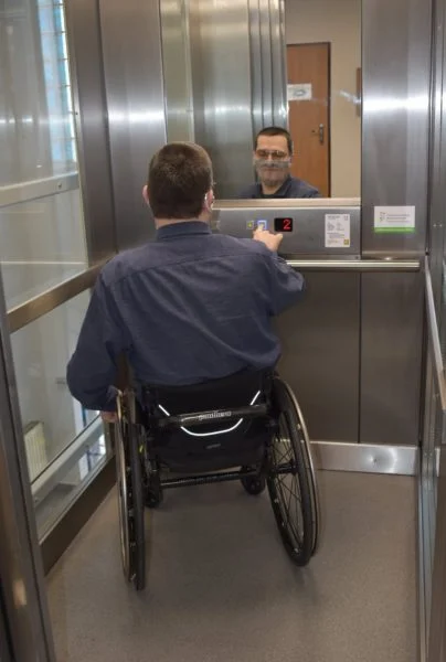 W budynku Starostwa Powiatowego w Mikołowie zamontowana została winda, dzięki której osoby mające problem z poruszaniem się mogą dotrzeć do dowolnego miejsca w naszym gmachu.