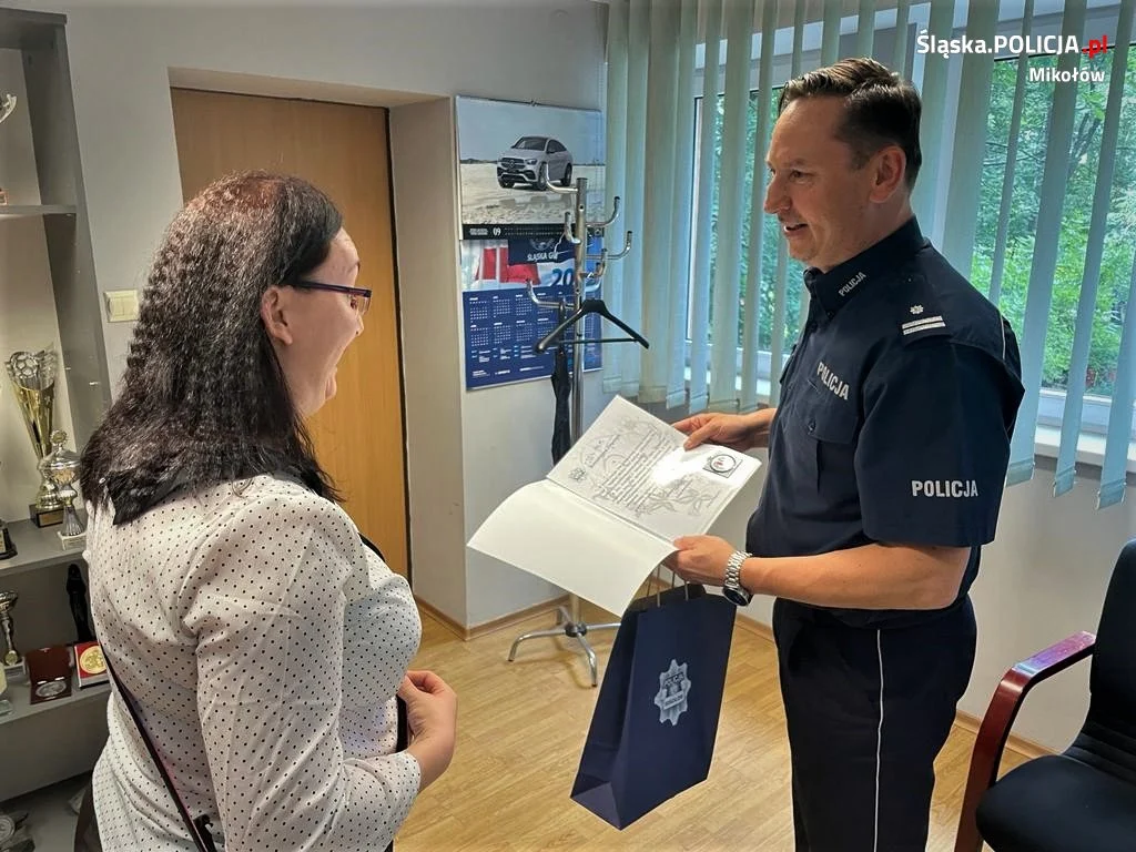 Szef mikołowskich policjantów podinsp. Dariusz Klimczak spotkał się z Panią Katarzyną i podziękował jej za prawidłową reakcję. Komendant podkreślił, że takie zachowanie wymaga odwagi, zatem zasługuje na najwyższe uznanie i szacunek. Pani Katarzyna otrzymała list gratulacyjny i drobny upominek.