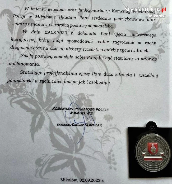 Komendant Powiatowy Policji w Mikołowie podziękował Pani Katarzynie za właściwą reakcję i stanowczy sprzeciw wobec naruszenia podstawowych zasad bezpieczeństwa na drodze.