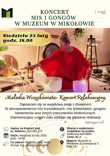 Już 23 lutego 2025 o godz. 18:00 w Muzeum w Mikołowie odbędzie się niezwykły koncert relaksacyjny, który przeniesie uczestników w świat harmonii i głębokiego odprężenia. Wydarzenie poprowadzi Katarzyna Lech, a w programie znajdzie się muzyczna sesja przy akompaniamencie mis kryształowych, mis tybetańskich, gongów i kamertonów.