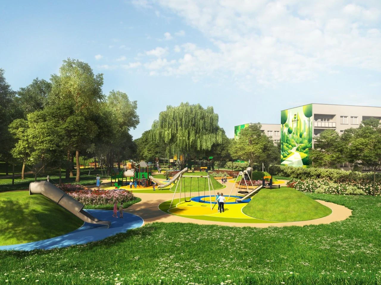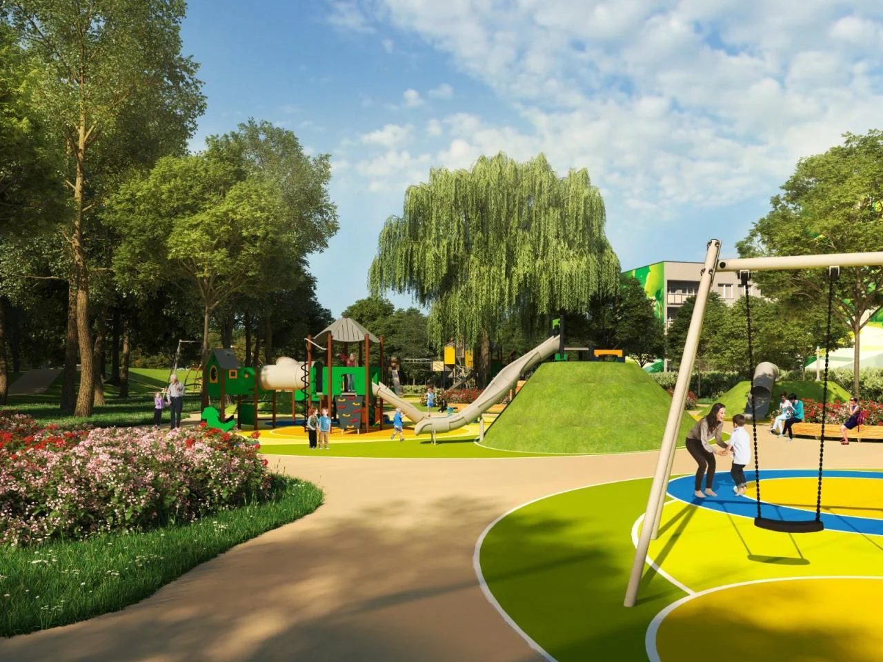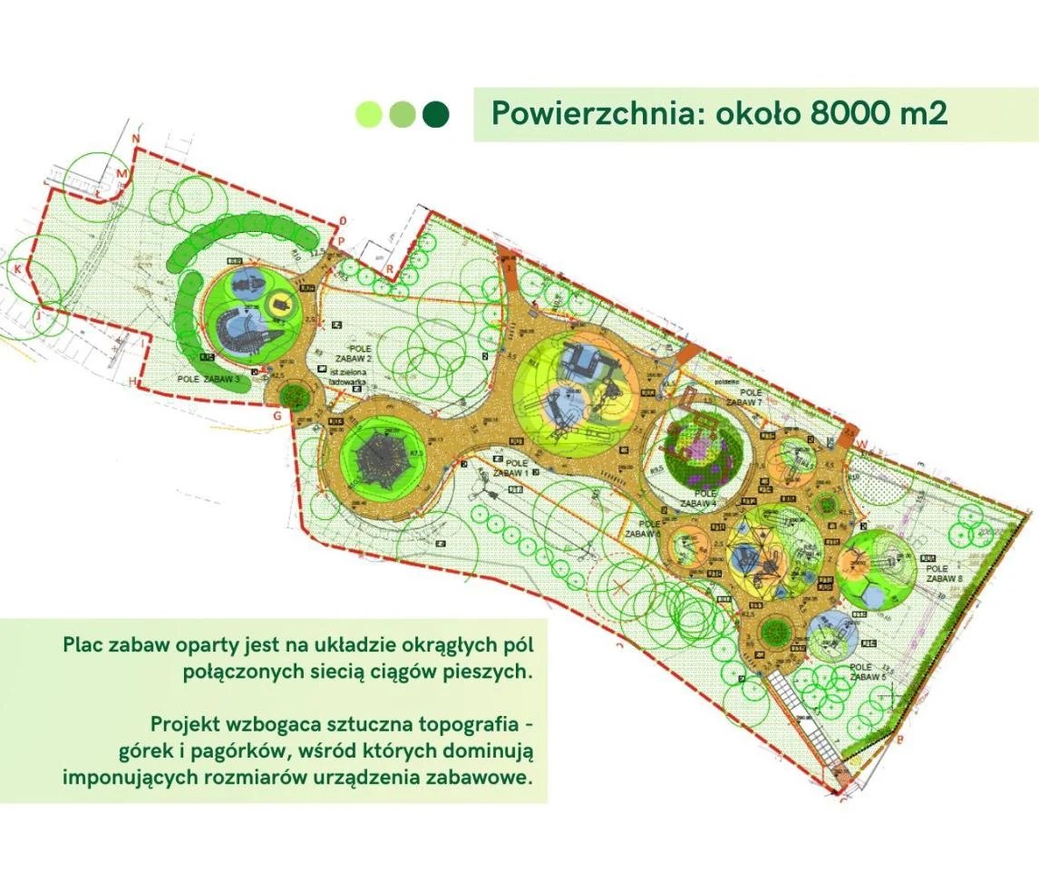 Projekt placu zabaw opiera się na okrągłych polach połączonych ścieżkami, z pagórkami i różnicami terenu, które mają tworzyć przestrzeń pełną kolorów, ruchu i wyobraźni. To miejsce, które ma nie tylko zaspokajać potrzeby dzieci, ale także integrować społeczność lokalną.