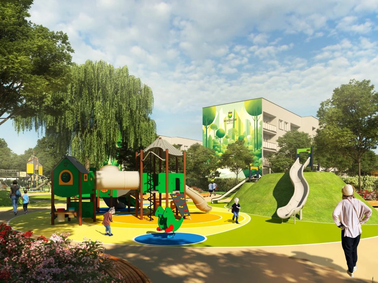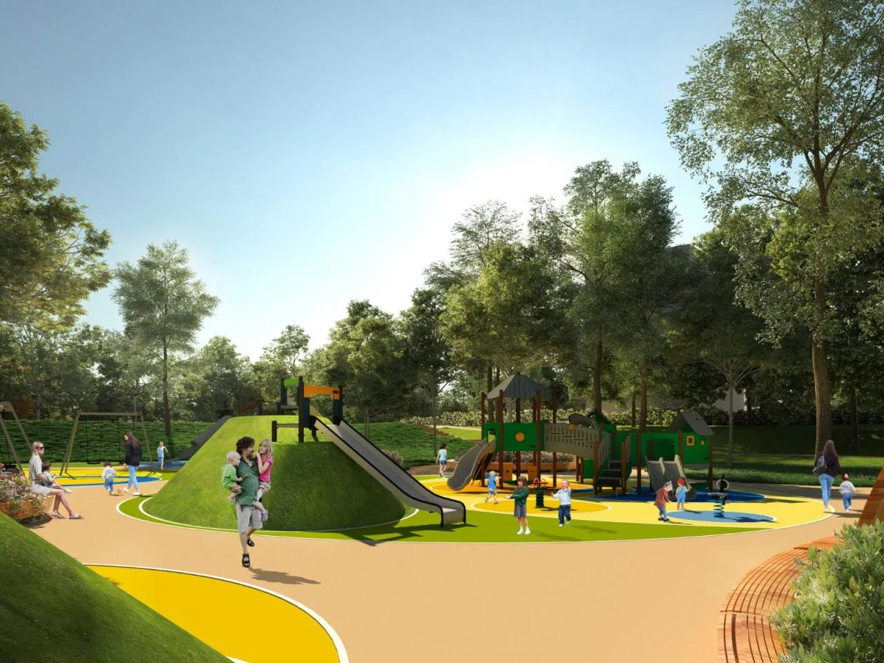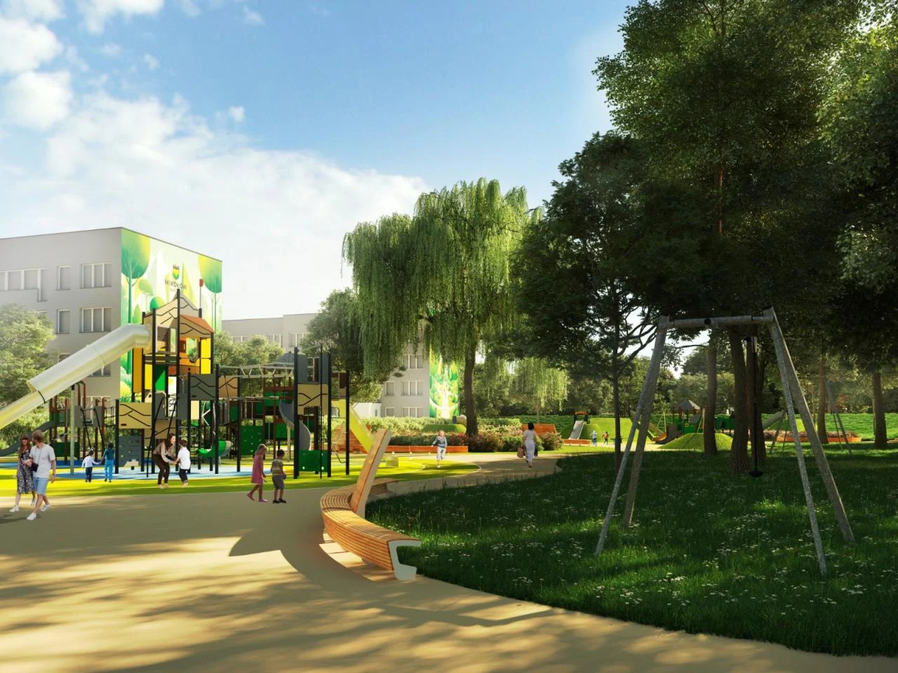 Projekt placu zabaw opiera się na okrągłych polach połączonych ścieżkami, z pagórkami i różnicami terenu, które mają tworzyć przestrzeń pełną kolorów, ruchu i wyobraźni. To miejsce, które ma nie tylko zaspokajać potrzeby dzieci, ale także integrować społeczność lokalną.