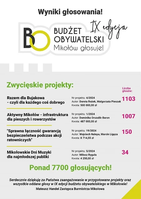 W tegorocznej IX edycji Budżetu Obywatelskiego w Mikołowie zwyciężyły projekty, które zdobyły najwięcej głosów mieszkańców, realizując lokalne potrzeby.