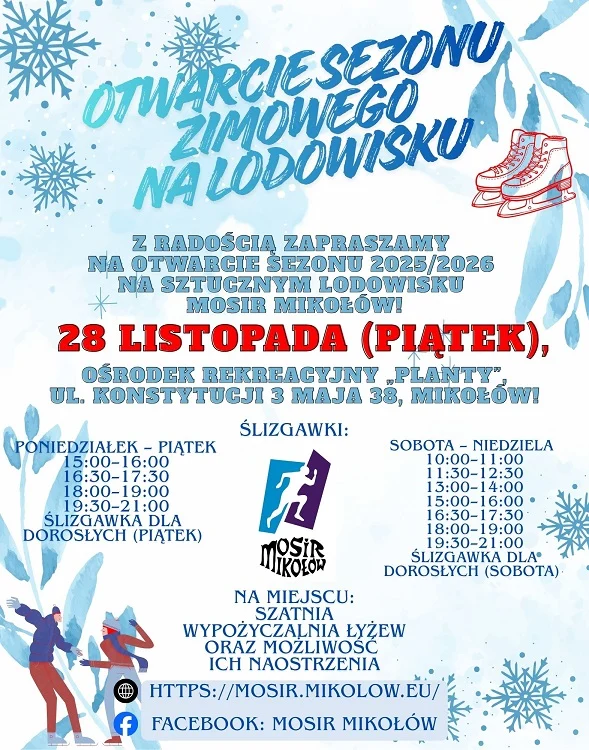 MOSiR Mikołów zaprasza mieszkańców na rozpoczęcie sezonu zimowego na lodowisku. Już 28 listopada (piątek) rusza sztucznelodowisko w Ośrodku Rekreacyjnym „Planty” przy ul. Konstytucji 3 Maja 38. To doskonała okazja, by aktywnie spędzić czas z rodziną i znajomymi, założyć łyżwy i wejść w zimowy klimat z uśmiechem.