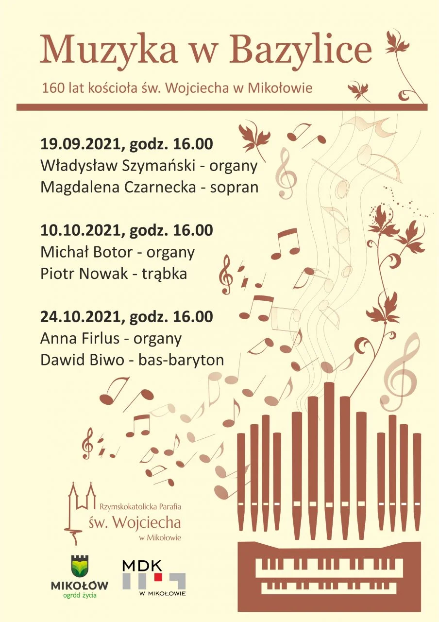 To już drugi rok, kiedy z powodu pandemicznych restrykcji nie odbywają się Mikołowskie Dni Muzyki. Czekając na te przyszłoroczne, które – jak wierzymy – uda się zorganizować, wpisując w świętowanie jubileuszu 800-lecia naszego miasta, zapraszamy na serię koncertów pod hasłem „Muzyka w Bazylice”.