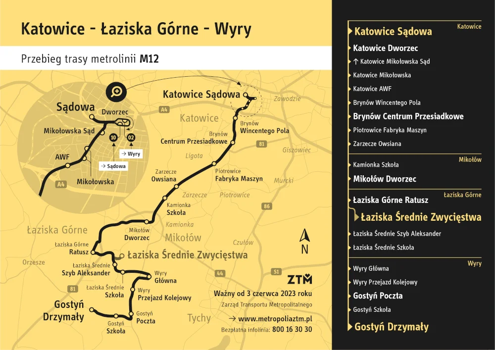 3 czerwca uruchomiona zostanie nowa linia metropolitalna M12 kursująca na trasie Katowice Sądowa – Gostyń Drzymały, która:
