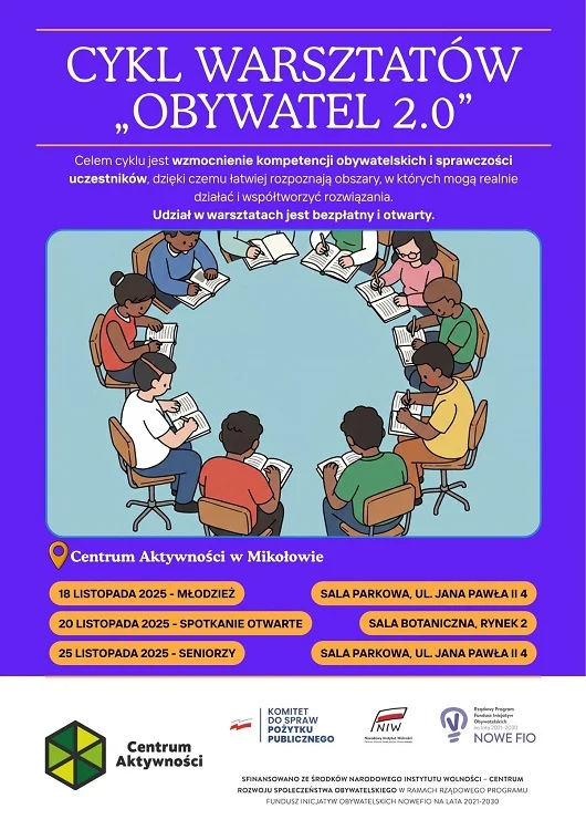 Miasto Mikołów zaprasza do udziału w cyklu warsztatów „Obywatel 2.0”, które mają na celu wzmocnienie współpracy międzypokoleniowej w lokalnej społeczności. Inicjatywa skierowana jest do seniorów oraz młodzieży, którzy spotkają się, aby razem nauczyć się, jak praktycznie działać na rzecz swojego otoczenia i tworzyć rozwiązania dlawspólnych wyzwań.