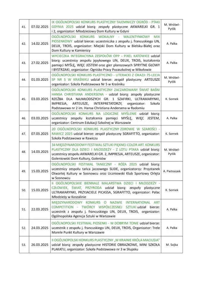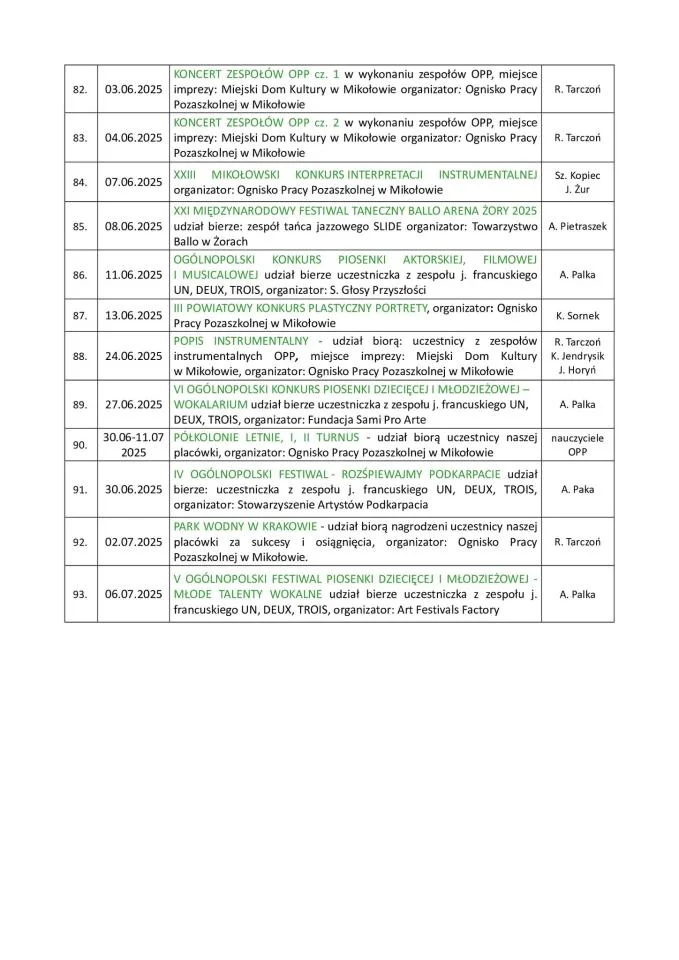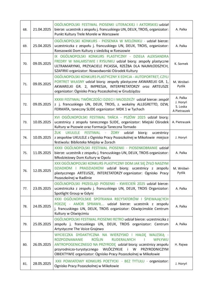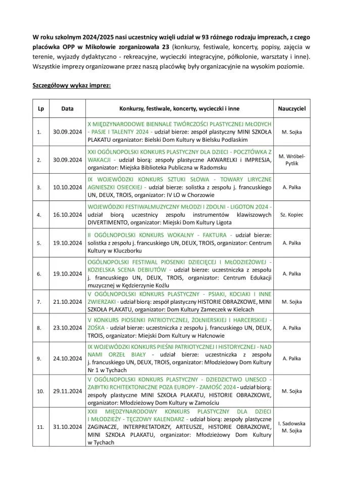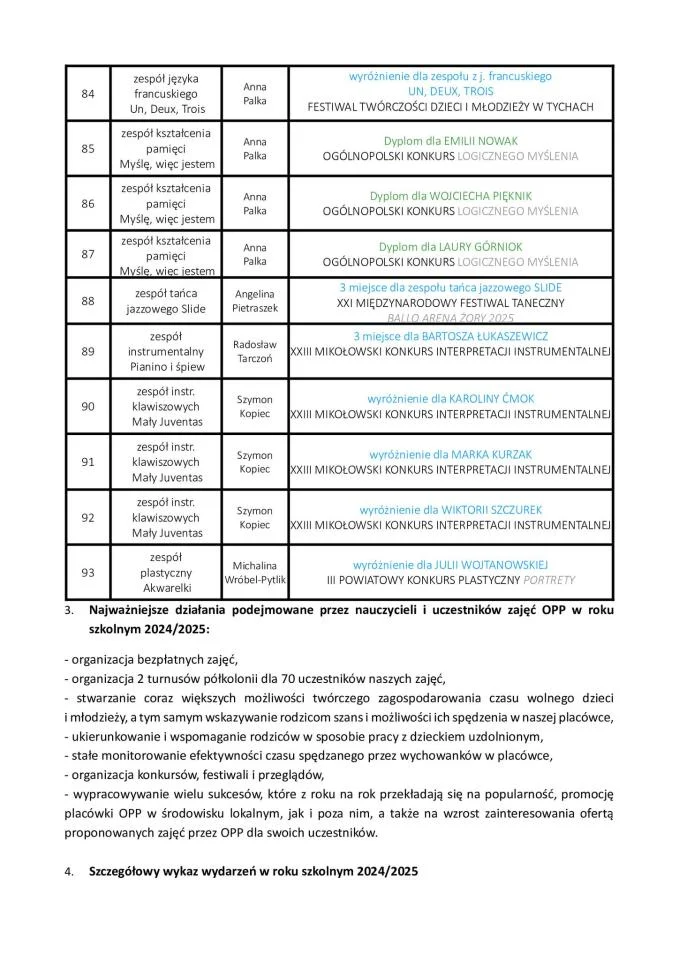 W roku szkolnym 2024/2025 Ognisko Pracy Pozaszkolnej zorganizowało 23 imprezy dla lokalnego środowiska oraz sześć konkursów dla dzieci i młodzieży. Ponadto, nasi wychowankowie wzięli udział w 93 wydarzeniach, takich jak wycieczki, konkursy, koncerty, festiwale, popisy czy pokazy, zdobywając laury w 92 konkursach. Były to wydarzenia międzynarodowe, ogólnopolskie, wojewódzkie, regionalne i powiatowe.