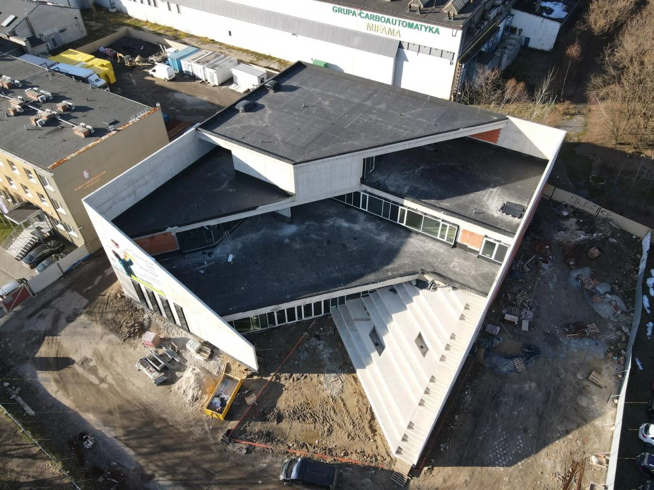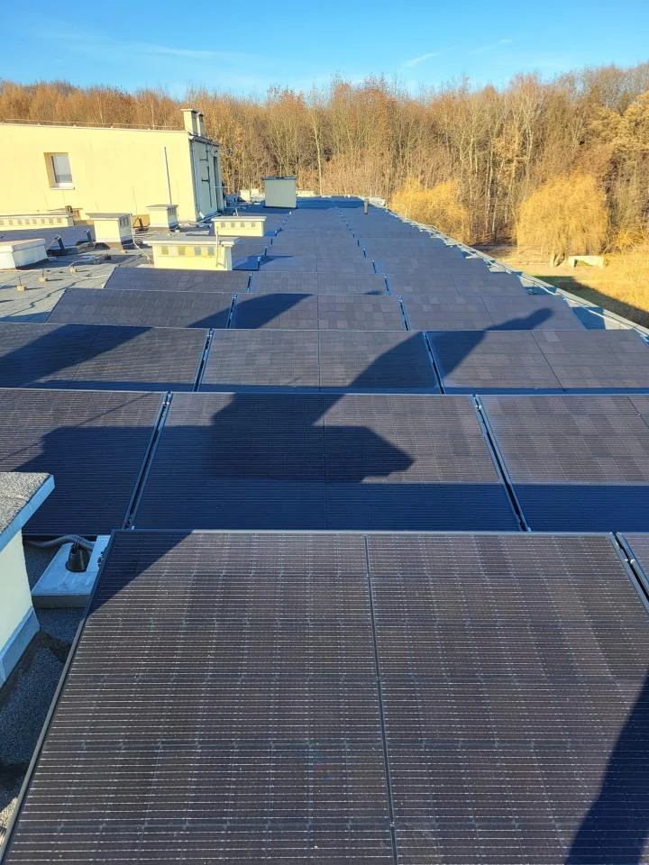 Fotografie z placu budowy OPP oraz instalacji fotowoltaicznych zainstalowanych na terenie Domu Dziecka oraz Domu Pomocy Społecznej w Orzeszu.