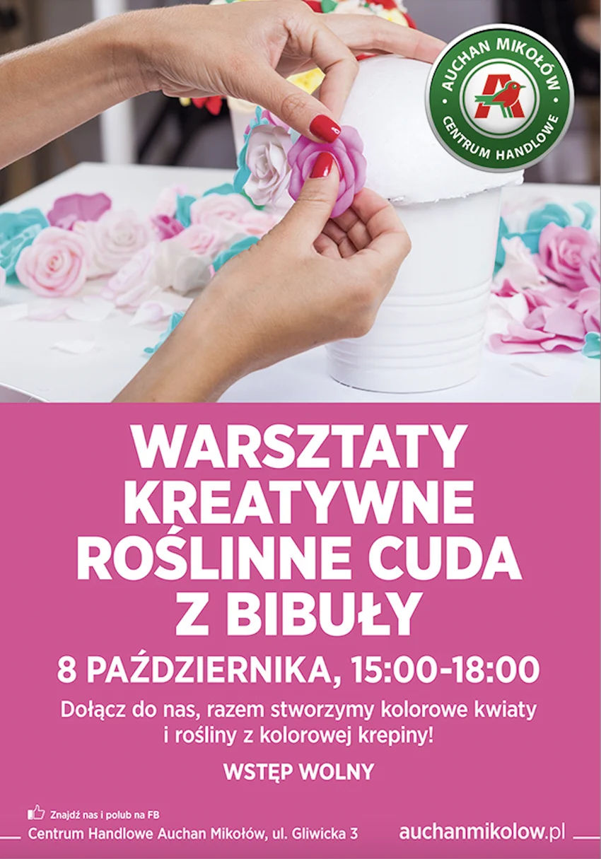 Kreatywne warsztaty bibułkarskie odbędą się w sobotę 8 października w godzinach 15:00-18:00 w Centrum Handlowym Auchan Mikołów przy ulicy Gliwickiej 3 w Mikołowie. Udział w zajęciach jest bezpłatny, a materia-ły zapewnia organizator.