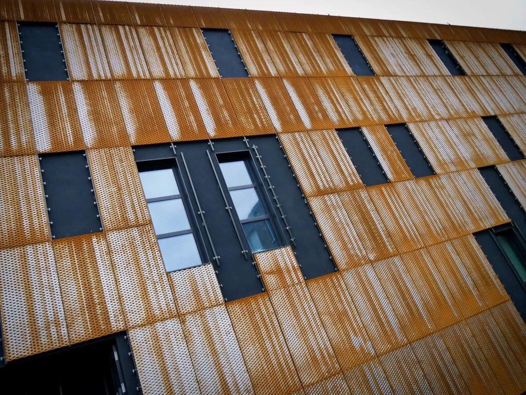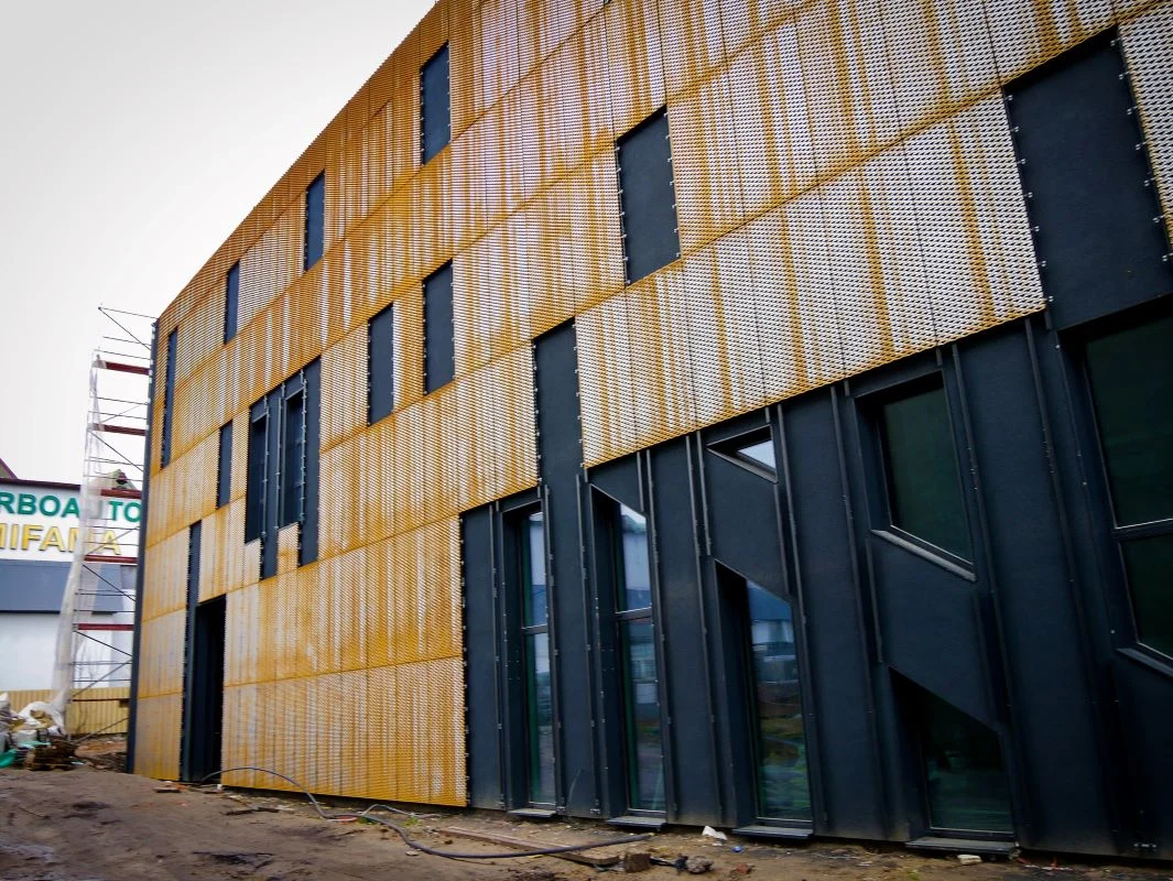 Na elewacji budynku pojawiły się panele ze stali kortenowskiej, które stanowią istotny element wykończenia. Stal corten to materiał o zwiększonej odporności na korozję atmosferyczną, który pod wpływem warunków pogodowych nabiera charakterystycznej patyny o ciekawej strukturze. Brązowo-pomarańczowy nalot na stali przypomina rdzę, jednak nie wpływa negatywnie na powierzchnię, wręcz przeciwnie – chroni ją przed dalszymi uszkodzeniami.