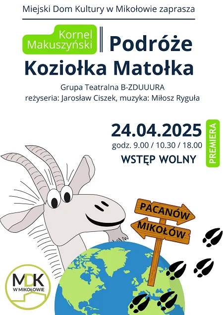 24 kwietnia 2025 roku o godzinie 18:00 w Mikołowie odbędzie się premiera spektaklu „Podróże Koziołka Matołka” w wykonaniu Grupy Teatralnej B-ZDUUURA. Widowisko skierowane jest do dzieci od 6. roku życia, a wstęp na wydarzenie jest bezpłatny.
