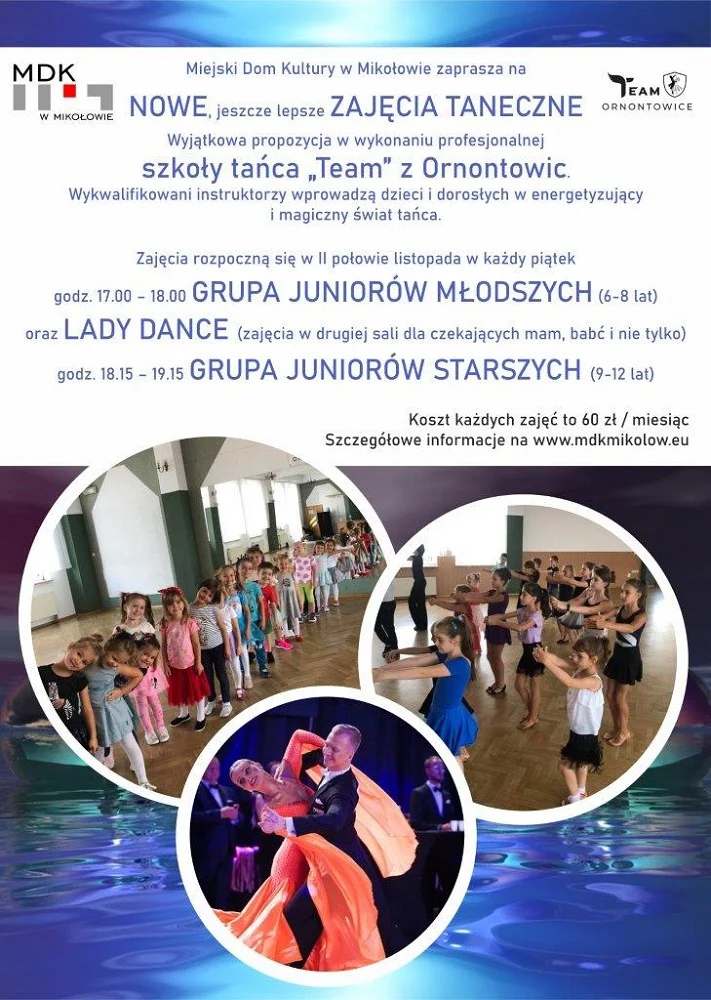 Zajęcia, które rozpoczną się w II połowie listopada, poprowadzą instruktorzy profesjonalnej szkoły tańca „Team” z Ornontowic. Propozycja na piątkowe popołudnia to zajęcia dla dwóch grup dziecięcych (6-8 oraz 9-12 lat), a także specjalna sekcja LADY DANCE (w drugiej sali dla czekających mam, babć i nie tylko).