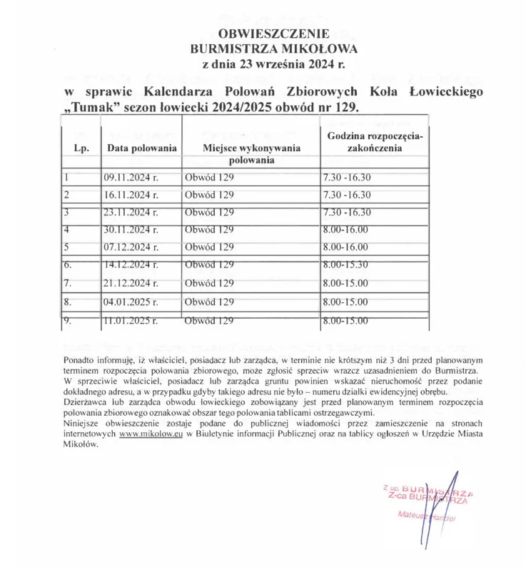 Burmistrz Mikołowa wydał oficjalne obwieszczenie z dnia 23 września 2024 r., dotyczące Kalendarza Polowań Zbiorowych Koła Łowieckiego „TUMAK”. Polowania te obejmują sezon łowiecki 2024/25 na terenie obwodu nr 129. Jest to ważna informacja dla mieszkańców gminy Mikołów, zwłaszcza w kontekście bezpieczeństwa i planowania aktywności na terenach objętych polowaniami.