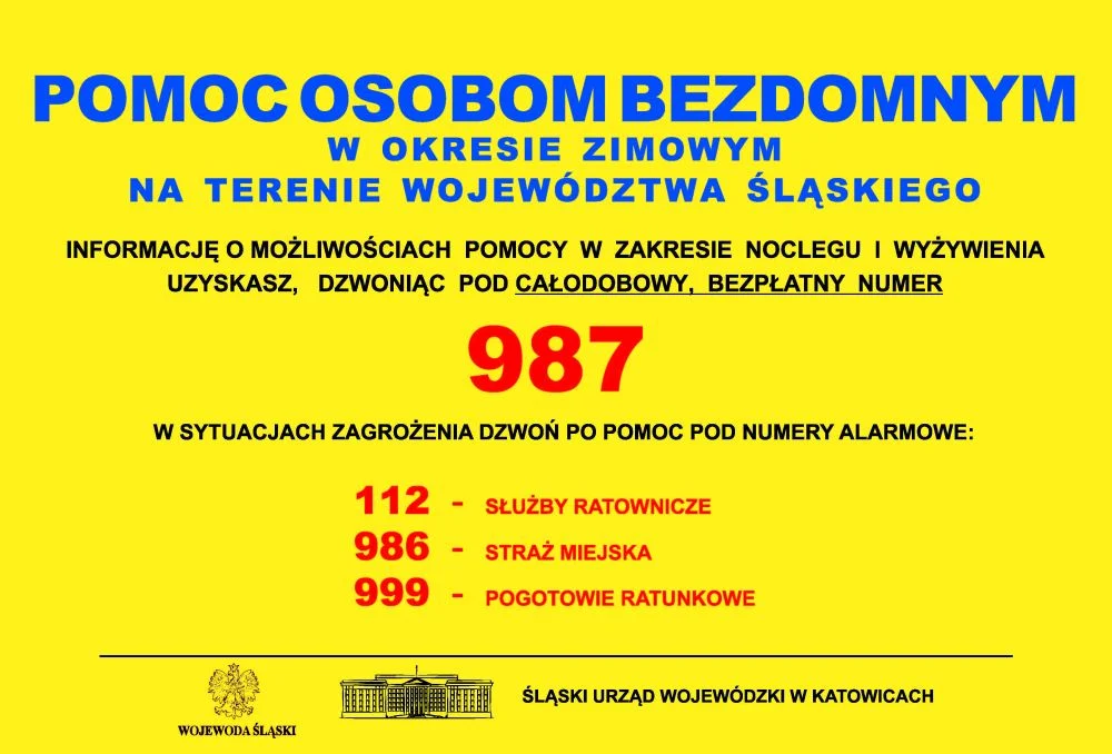 Wojewódzkie Centrum Zarządzania Kryzysowego uruchomiło bezpłatną infolinię 987, która dostępna jest dla osób bezdomnych z terenu województwa śląskiego. Pod tym numerem można uzyskać informacje o możliwości skorzystania z noclegu i wyżywienia, a infolinia działa całodobowo, siedem dni w tygodniu.