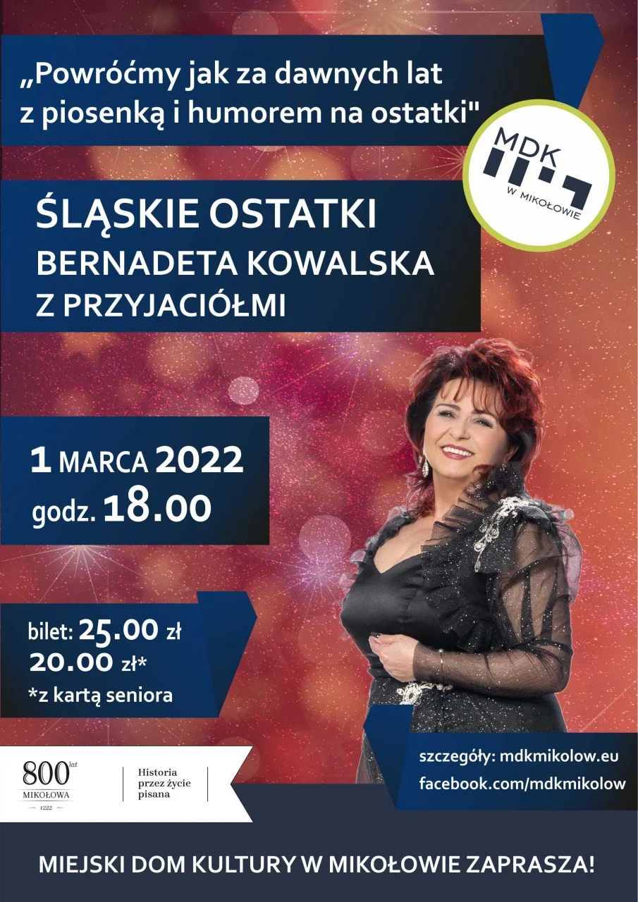 We wtorek 1 marca, w ostatni dzień tegorocznego karnawału, spotkajmy się w Miejskim Domu Kultury na koncercie znanej i lubianej gwiazdy śląskiej sceny muzycznej, Bernadety Kowalskiej.
