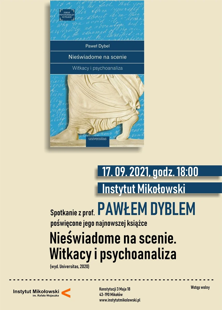 Instytut Mikołowski zaprasza na spotkanie z prof. Pawłem Dyblem poświęcone jego najnowszej książce Nieświadome na scenie. Witkacy i psychoanaliza (wyd. Universitas, 2020) – 17. 09. godz. 18:00.