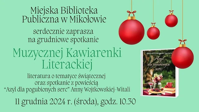 Miejska Biblioteka Publiczna w Mikołowie zaprasza na grudniowe spotkanie Muzycznej Kawiarenki Literackiej, które odbędzie się 11 grudnia 2024 roku (środa). Tematem spotkania będzie literatura świąteczna, a o swojej książce pt. „Azyl dla pogubionych serc” opowie autorka Anna Wojtkowska-Witala.
