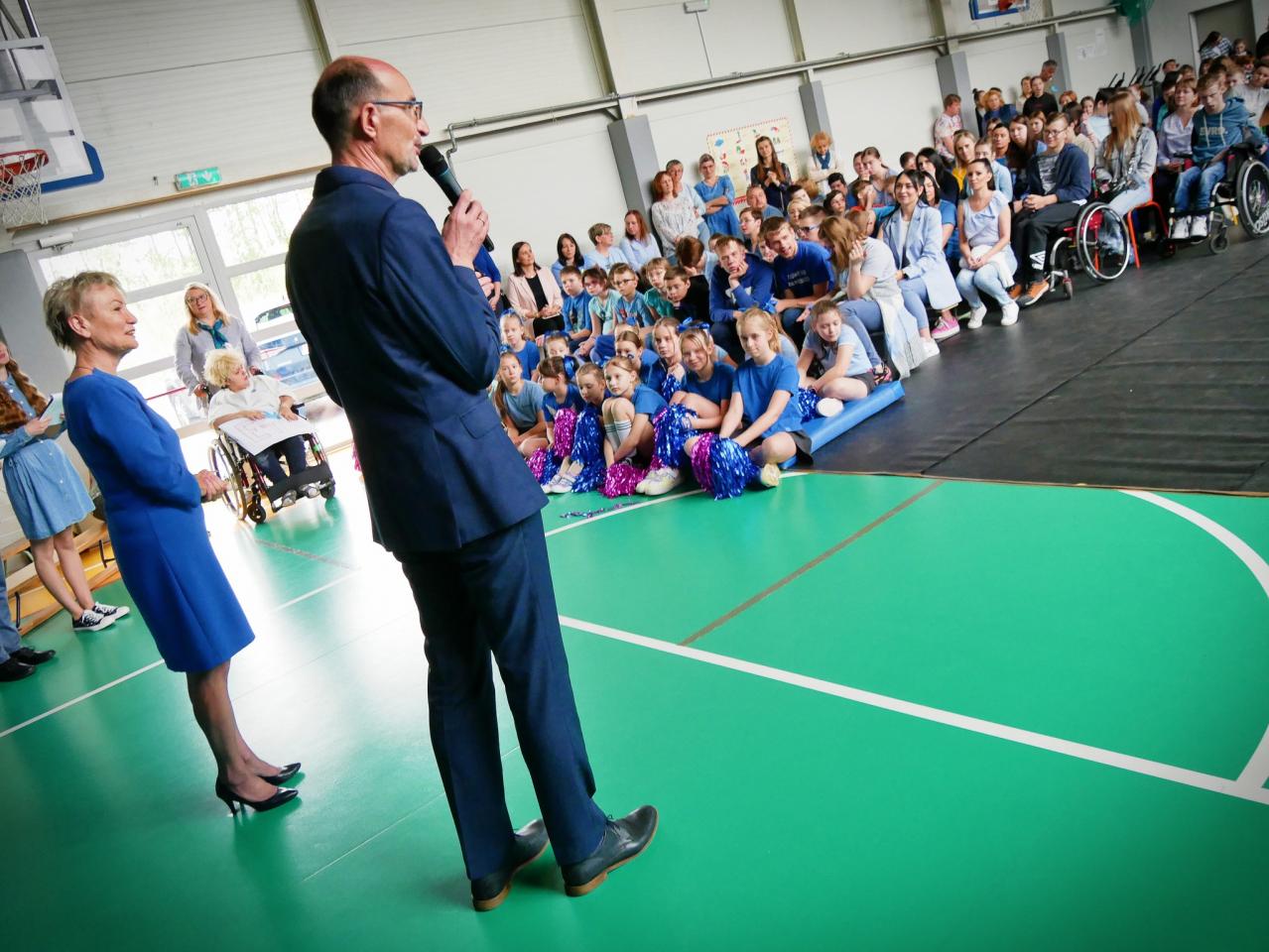 Sala gimnastyczna, w której odbywało się wydarzenie, była ozdobionaniebieskimi dekoracjami, gdyż ten kolor jest symbolem solidarności z osobami dotkniętymi autyzmem.