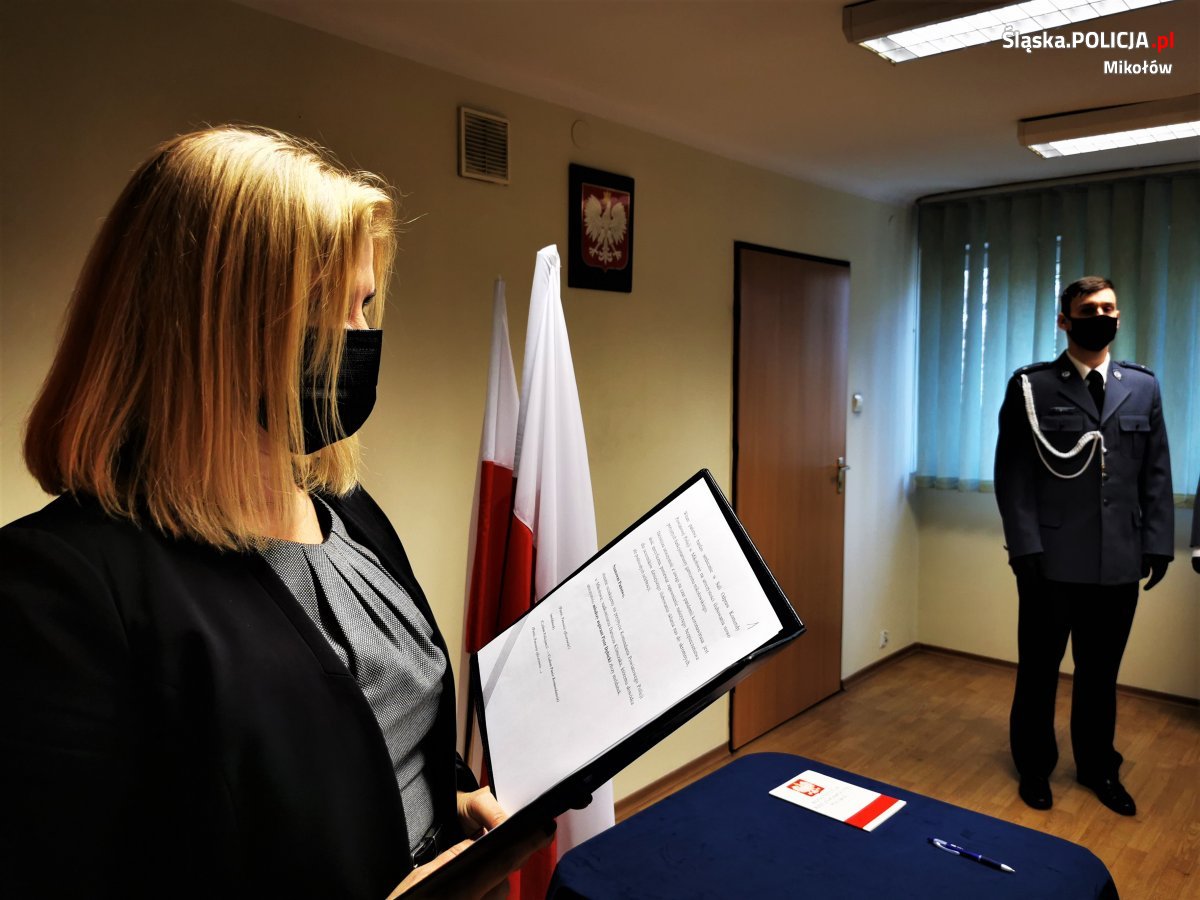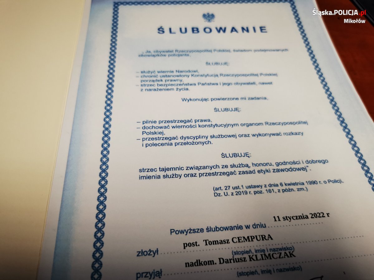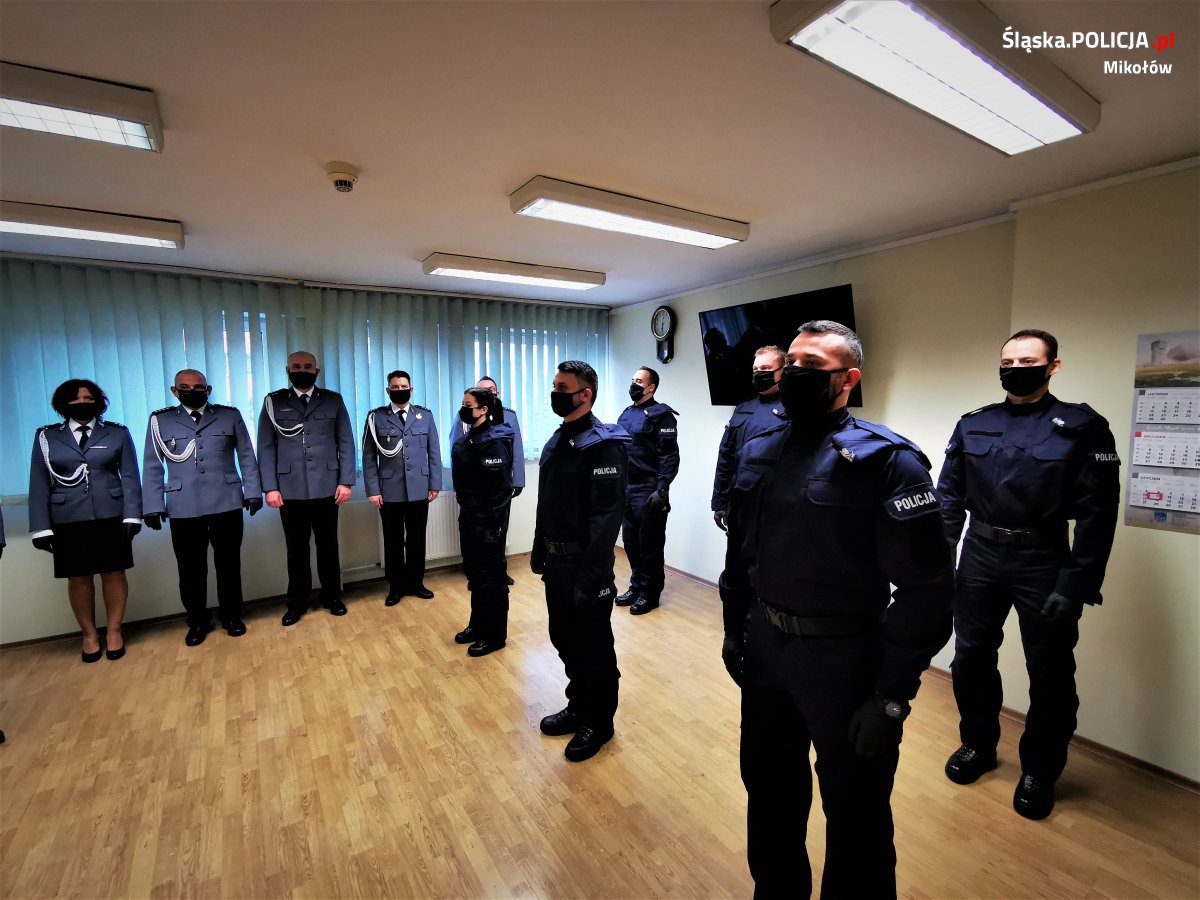Uroczyste ślubowanie odbyło się w poniedziałek 11 stycznia rano w sali odpraw Komendy Powiatowej Policji w Mikołowie. Zbiórka rozpoczęła się od zdania meldunku Komendantowi Powiatowemu Policji w Mikołowie nadkom. Dariuszowi Klimczakowi przez dowódcę uroczystości mł.asp. Piotra Dębickiego. Minutą ciszy uczczono pamięć poległych na służbie funkcjonariuszy, po czym odbyło się ślubowanie nowo przyjętych mundurowych, którzy z ogromną dumą i radością wypowiedzieli słowa policyjnej roty.