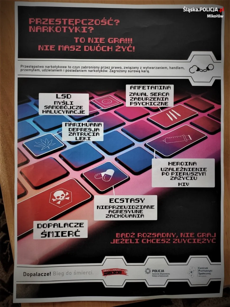 Mikołowscy policjanci zajmujący się profilaktyką wśród młodzieży starają się w każdy możliwy sposób przekonać uczniów do rezygnacji z substancji, które prowadzą do nałogów, a w rezultacie niszczą ludzkie zdrowie i życie. Tym razem, w ramach kampanii „Narkotyki i dopalacze zabijają”, odwiedzili placówki szkolne powiatu mikołowskiego, gdzie przekazali plakaty nawiązujące do tematyki zagrożeń związanych z zażywaniem narkotyków i nowych substancji psychoaktywnych.