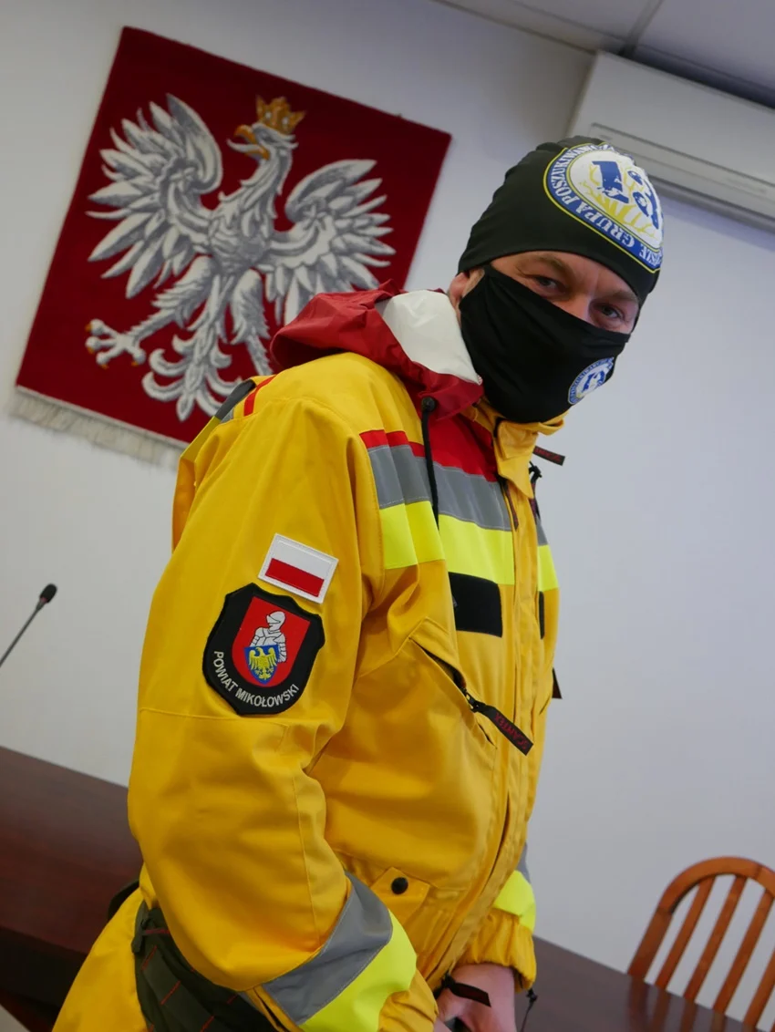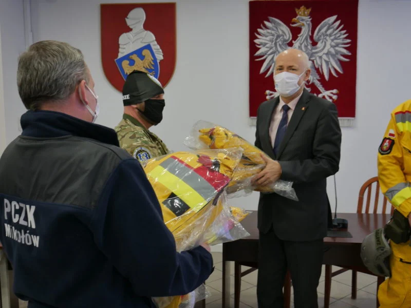 Starosta Mikołowski Mirosław Duży oraz naczelnik Wydziału Zarządzania Bezpieczeństwem Starostwa Powiatowego w Mikołowie Bartłomiej Depta przekazali wczoraj dowódcom orzeskiej „13 Grupy Poszukiwawczo-Ratowniczej Orzesze” ufundowane przez Powiat specjalne kombinezony „Scantex”.