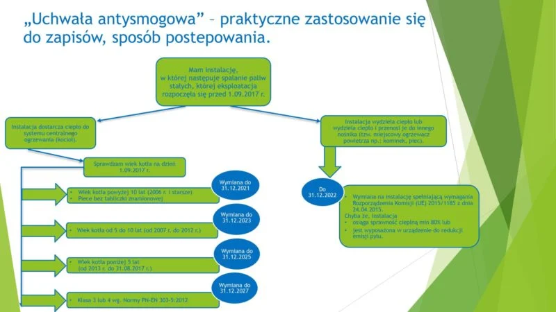 Najbliższy termin wynikający z uchwały, który nakłada na właścicieli budynków obowiązek wymiany źródeł ciepła to koniec roku 2021 i dotyczy tych pieców, które są eksploatowane dłużej niż 10 lat od daty ich produkcji lub gdy nie posiadają tabliczki znamionowej.