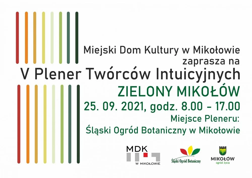 Już po raz piąty Miejski Dom Kultury w Mikołowie organizuje plener malarski dla twórców intuicyjnych. W tym roku spotkamy się 25 września w Śląskim Ogrodzie Botanicznym, by wspólnie twórczo przepracować, zinterpretować i przedstawić hasło „Zielony Mikołów”. Celem pleneru jest promocja amatorskiej twórczości artystycznej, propagowanie artystów nieprofesjonalnych oraz promocja naszego miasta. Wydarzenie odbywa się pod honorowym patronatem Burmistrza Mikołowa Stanisława Piechuli.