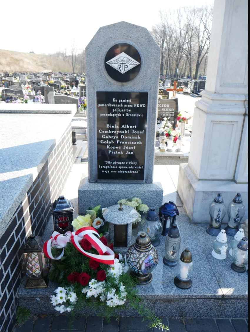 Na bujakowskiej tablicy widnieją nazwiska 16 policjantów z Mikołowa zamordowanych wiosną 1940 roku w Kalininie, spoczywających na polskim cmentarzu wojskowym w Miednoje, natomiast pomnik na ornontowickim cmentarzu upamiętnia nazwiska 6 funkcjonariuszy policji II RP pochodzących z Ornontowic.