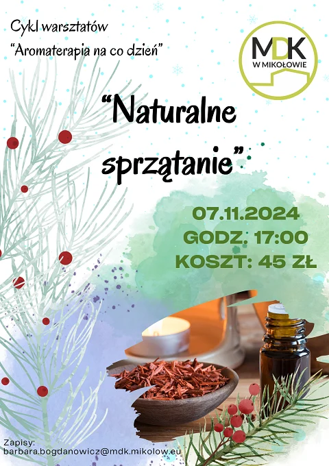 7 listopada 2024 roku o godz. 17:00 odbędą się kolejne warsztaty z cyklu aromaterapii w Mikołowie. Tym razem uczestnicy poznają techniki naturalnego sprzątania z wykorzystaniem olejków eterycznych. Własnoręczne tworzenie mieszanek do porządków to idealny sposób na ekologiczne przygotowanie domu na nadchodzące święta Bożego Narodzenia.