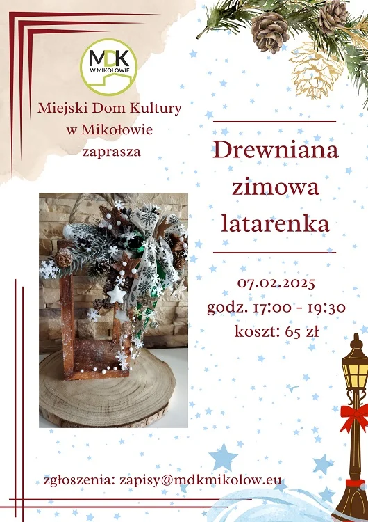 MDK Mikołów zaprasza na wyjątkowe warsztaty scrapbookingowe, które odbędą się 7 lutego 2025 roku w godzinach 17:00–19:30 w Miejskim Domu Kultury w Mikołowie. Podczas zajęć stworzymy drewnianą latarenkę o wymiarach około 27 x 13,5 cm, idealną jako zimową dekorację.