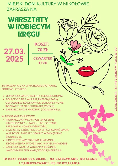 27 marca w godz. 17:30 – 19:30 w Miejskim Domu Kultury w Mikołowie odbędą się kolejne warsztaty z cyklu „W kobiecym kręgu”. To wyjątkowy czas dla kobiet, które pragną odpocząć, nabrać energii i spędzić czas w inspirującym towarzystwie.