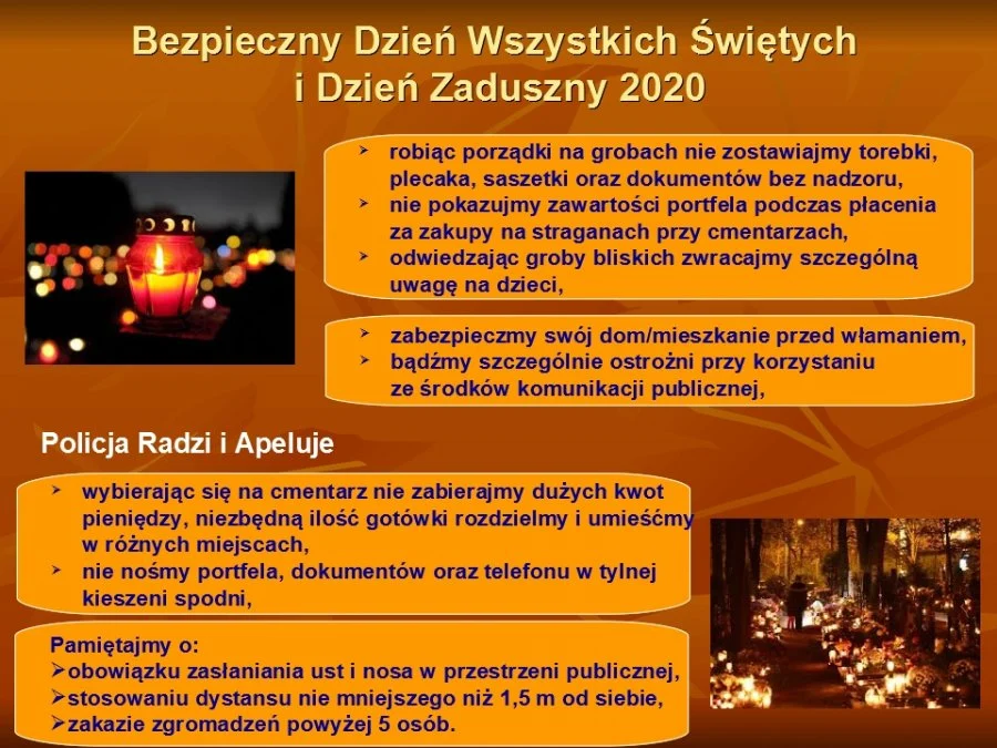 Apelujemy do pieszych, odwiedzających groby bliskich, by korzystali z chodników, a w przypadku ich braku – z pobocza znajdującego się z lewej strony drogi. Pamiętajmy o używaniu elementów odblaskowych. W dużym stopniu poprawiają one naszą widoczność, także w obszarze zabudowanym. Przed wejściem na jezdnię zachowajmy szczególną ostrożność i przechodźmy tylko w miejscach do tego wyznaczonych. Do kierowców apelujemy o ściągnięcie nogi z gazu i bezpieczną, zgodną z przepisami jazdę.