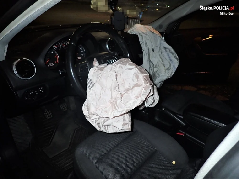 Do zdarzenia doszło w sobotę 15 października około godziny 20.50 w Mikołowie na skrzyżowaniu ulicy Gliwickiej i Narcyzów, tuż przy sklepie budowlanym. Ustalenia policjantów drogówki wskazują, że kierujący audi mieszkaniec Tychów, jadąc w kierunku centrum miasta, wjechał na skrzyżowanie na czerwonym świetle i z dużą siłą uderzył w prawidłowo jadącego volkswagena, którym podróżował 29-letni orzeszanin. Poszkodowany trafił do szpitala, gdzie stwierdzono obrażenia kręgosłupa. Uczestnicy wypadku byli trzeźwi.