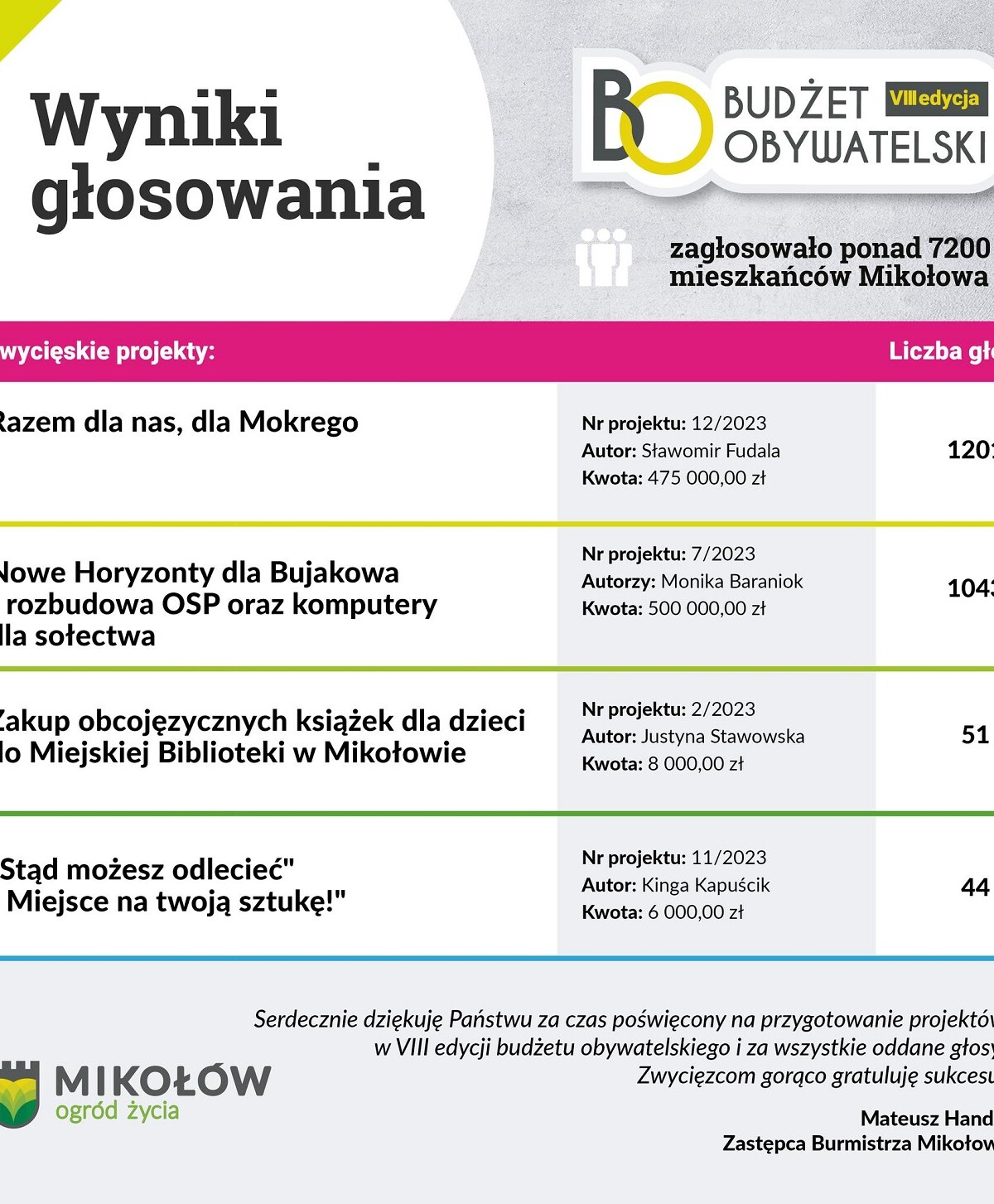| 1. | 12/2023 | Razem dla nas, dla Mokrego | Sławomir Fudala | 475 000,00 zł | 1201 |