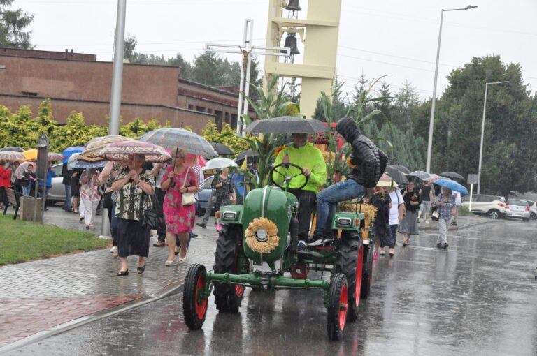 Mimo deszczowej pogody uczestnicy dożynek stawili się tłumnie najpierw na mszy świętej z tej intencji, a następnie przemaszerowali na pobliski teren przy boisku, aby kontynuować świętowanie.