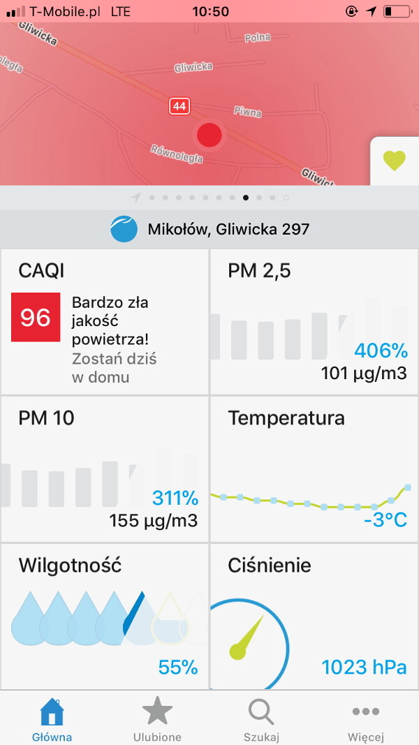 W tej chwili większość z nowych czujników zamontowanych na terenie powiatu mikołowskiego wskazuje złą, a nawet bardzo złą jakość powietrza. Stężenie szkodliwych pyłów PM10 i PM2,5 przekracza w niektórych miejscach 400 procent! Dodajmy, że to drugi raz w ciągu ostatnich kilku dni, kiedy mikołowianie mierzą się z poważnym zanieczyszczeniem powietrza [czytaj].