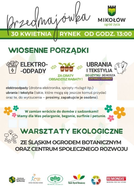 Już 30 kwietnia 2025 roku Rynek w Mikołowie zamieni się w centrum ekologicznych inicjatyw i dobrej zabawy. Podczas Przedmajówki mieszkańcy będą mogli oddać elektrośmieci i ubrania, wziąć udział w warsztatach ekologicznych, obejrzeć spektakl dla dzieci oraz posłuchać największych polskich przebojów na żywo.