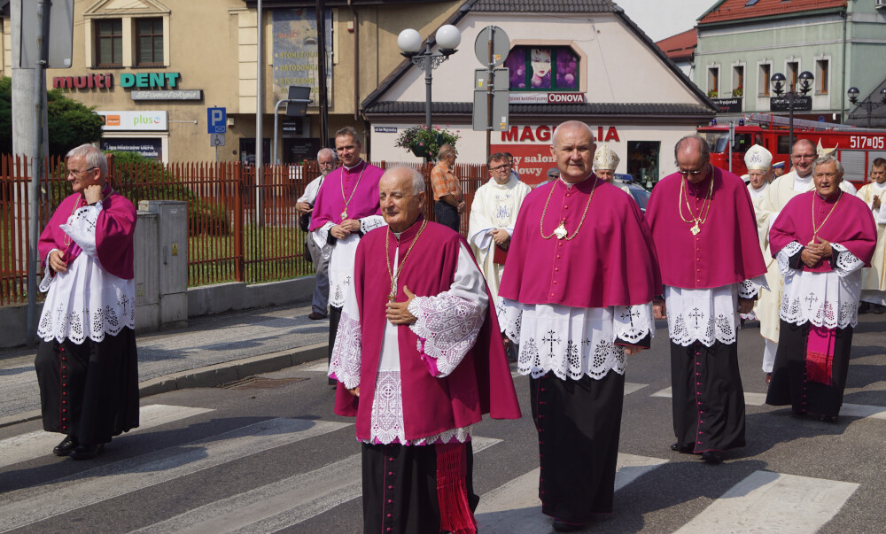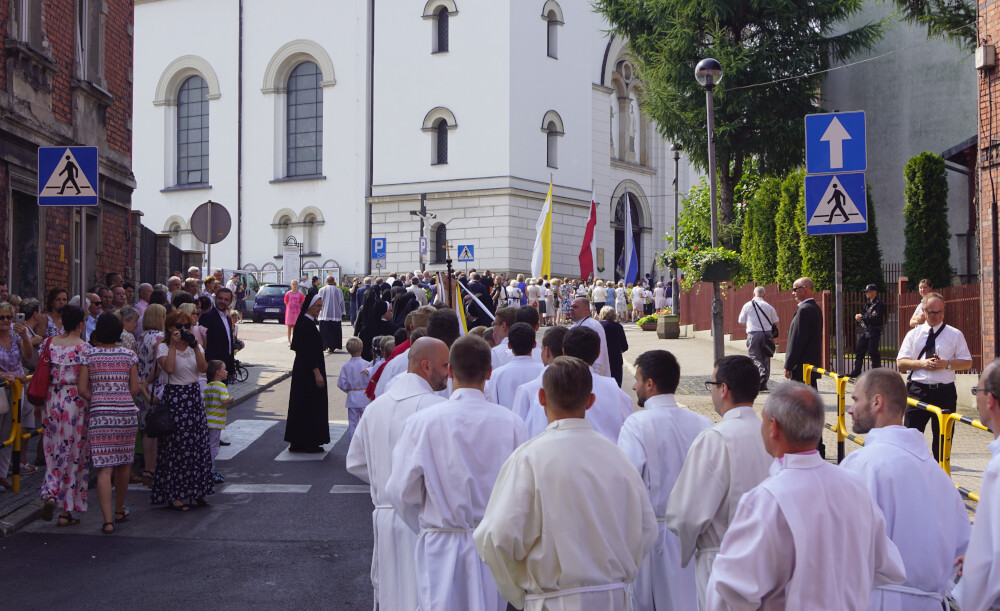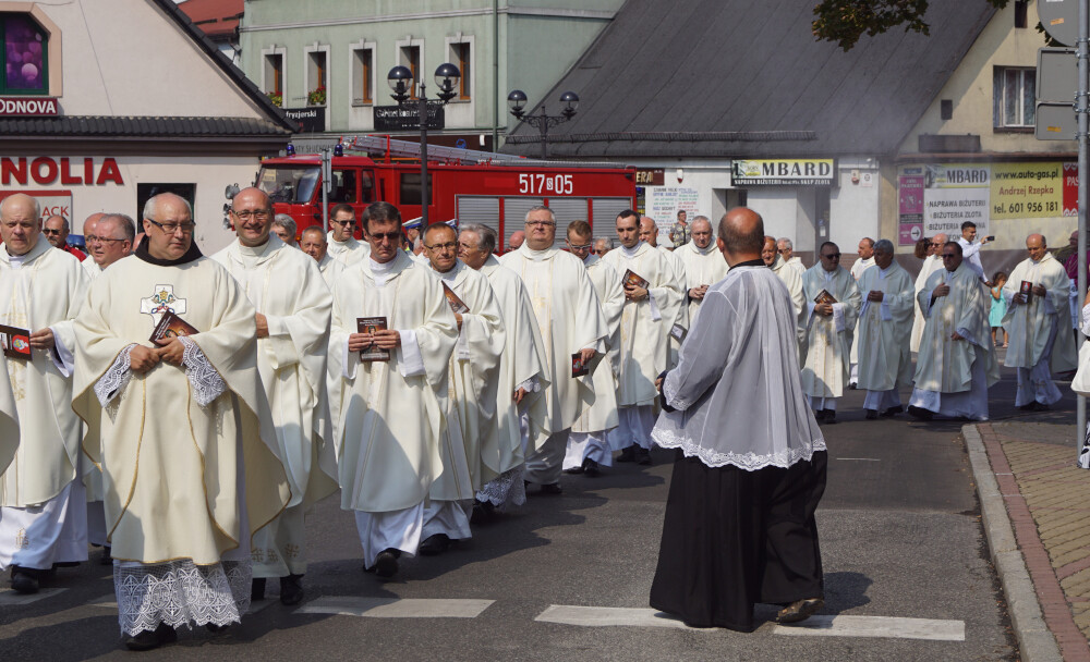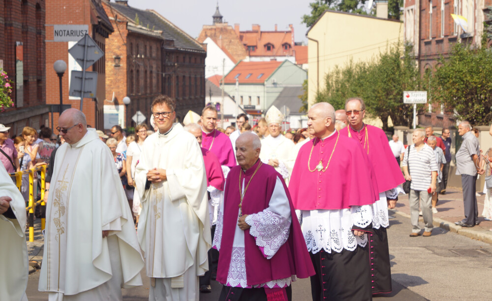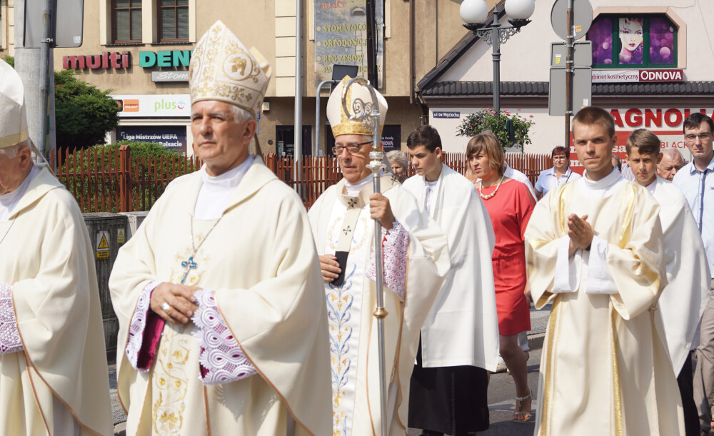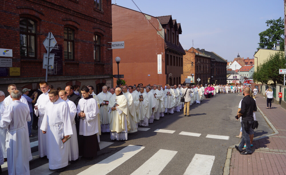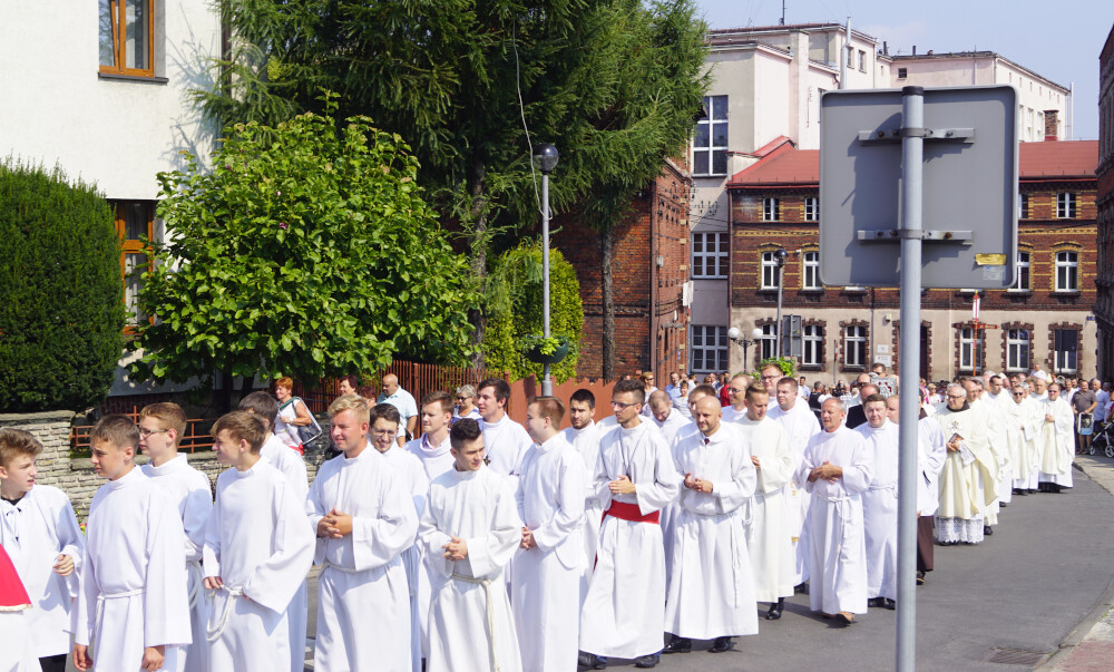 Uroczystości rozpoczęła procesja od parafii Matki Boskiej Śnieżnej wprost do Bazyliki św. Wojciecha. Mszę Świętą koncelebrowali metropolita katowicki, abp. Wiktor Skworc, abp. senior Damian Zimoń, bp. Adam Wodarczyk, bp. nominat Grzegorz Olszowski, bp. Marek Szkudło i ks. proboszcz Mirosław Godziek. Bazylikę do ostatniego miejsca wypełnili mikołowianie, lokalne władze samorządowe, zarówno przedstawiciele miasta z burmistrzem Mikołowa, Stanisławem Piechulą na czele, a także przedstawiciele starostwa, radni powiatowi i posłowie z okręgu, m.in. posłanka z ramienia PiS, Izabela Kloc. Zobaczyliśmy poczty sztandarowe szkół, służb mundurowych, zakładów pracy i organizacji kościelnych. W nabożeństwie udział wziął również proboszcz parafii ewangelicko-augsburskiej św. Jana w Mikołowie, ks. Kornel Undas.