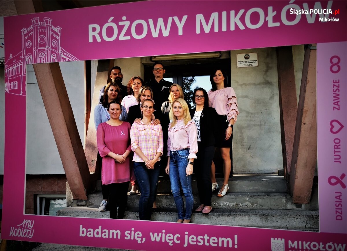 Przyodziani w różowe wstążki policjanci, policjantki oraz pracownicy cywilni mikołowskiej komendy po raz kolejny przyłączają się do akcji i zachęcają do udziału w działaniach profilaktycznych