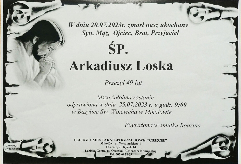 Ostanie pożegnanie Arkadiusza Loski odbędzie się we wtorek 25 lipca o godzinie 9.00 w Bazylice pod wezwaniem Świętego Wojciecha w Mikołowie - zawiadamia pogrążona w żałobie rodzina zmarłego.