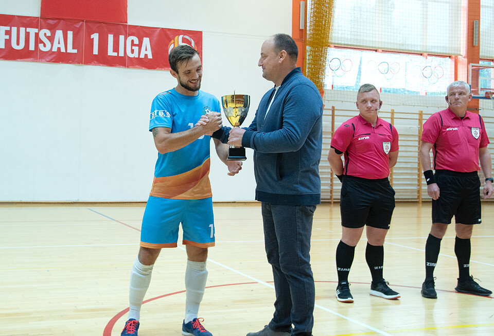 Trener Jakub Lubas odebrał cenne trofeum z rąk wiceprzewodniczącego Komisji Futsalu i Piłki Plażowej PZPN Grzegorza Morkisa.